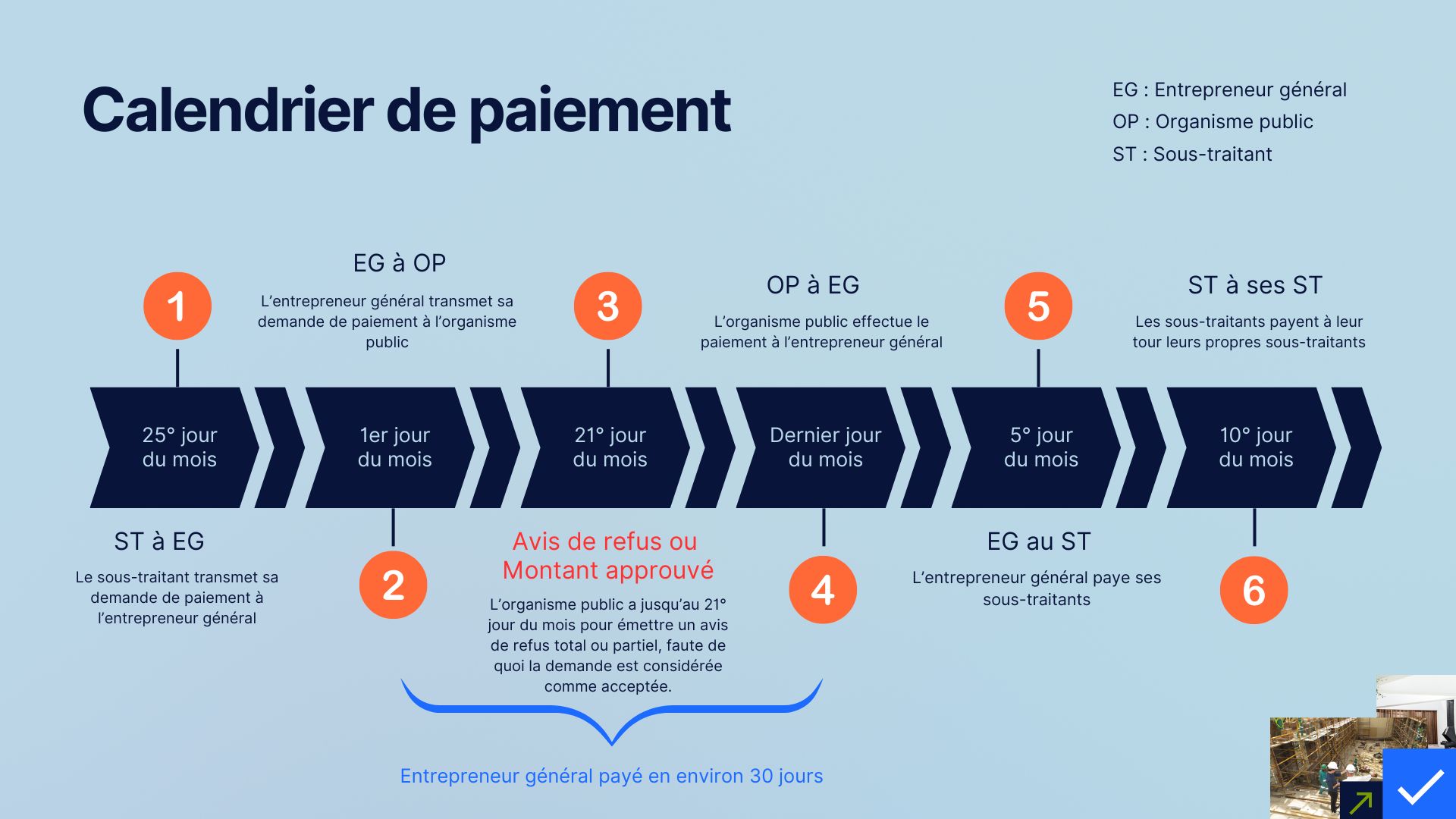 - Accélérer les paiements : Réduire les délais de paiement pour assurer une meilleure prévisibilité des paiements aux entrepreneurs et leurs sous-traitants.