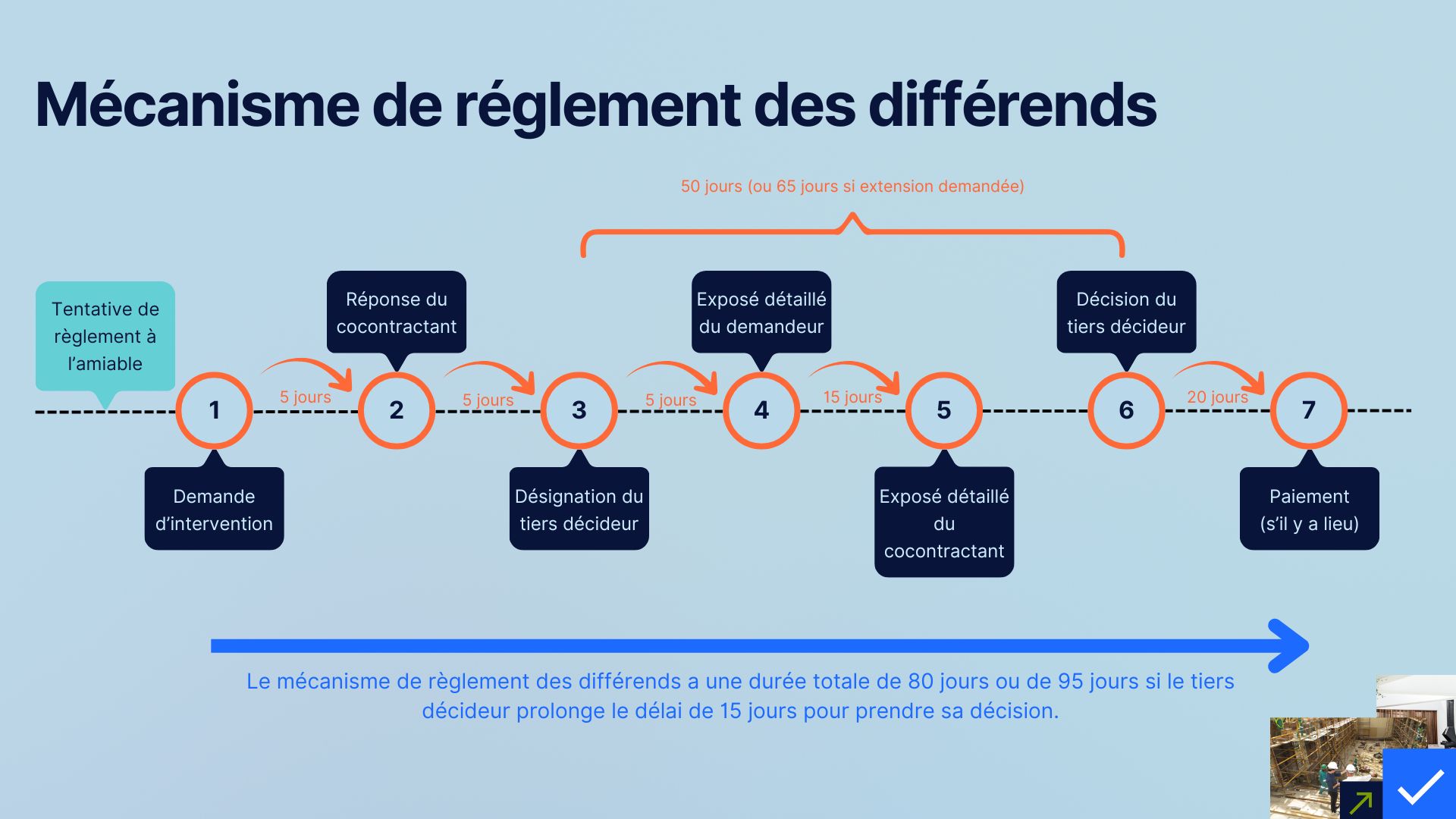 Finalement, la réglementation établit un nouveau régime complet de règlement rapide des différends, incluant des conditions d'exercice du droit de recours à un tiers décideur, des délais pour la notification des demandes d'intervention et les modalités de désignation et d'intervention des tiers décideurs. Ce processus, illustré dans la figure ci-dessous, comporte également son propre calendrier pour le dépôt d'un différend, la désignation d'un tiers, l'obtention d'une décision et le règlement des sommes dues, le cas échéant.